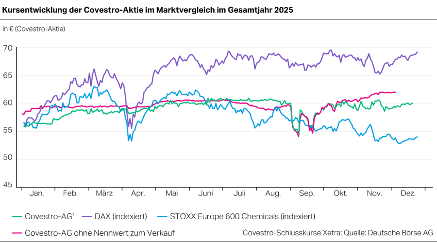 Der Verlauf der Covestro-Aktienkurse wurde während des gesamten Jahres 2025 weniger von der Geschäftsentwicklung oder anderen externen Einflussfaktoren bestimmt als vom Fortschritt der regulatorischen Freigaben, die im Rahmen der Übernahme durch die XRG P.J.S.C (XRG) (zuvor: ADNOC International Limited), Abu Dhabi (Vereinigte Arabische Emirate) eingeholt werden mussten. Der Kurs der Aktien im Streubesitz (1COV) näherte sich im Verlauf des Jahres dem Kurs der XRG angedienten Aktien (1CO) an. Lediglich kurz vor dem Abschluss der Übernahme stieg der Kurs der angedienten Aktien (1CO) dann fast auf den Angebotspreis an, während die regulären Aktien (1COV) um den Wert von 59,00 € konstant blieben.