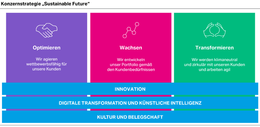 Unsere Strategie hat ihre Grundrichtung beibehalten. Dennoch wurden im Jahr 2025 entscheidende Anpassungen vorgenommen: Wir haben in den drei strategischen Kapiteln „Optimieren“, „Wachsen“ und „Transformieren“ den Fokus geschärft und erzeugen Dynamik durch klare Priorisierung und konsequente Umsetzung über alle Zeithorizonte. Wir „optimieren“ kurzfristig, „wachsen“ mittelfristig und „transformieren“ permanent. Die Kundenperspektive haben wir im Zentrum aller Kapitel verankert, die zeitliche Perspektive stärker hervorgehoben und den Weg unserer nachhaltigen sowie profitablen Transformation präzisiert. Als Wegbereiter ist neben einer starken Unternehmenskultur, der zukunftsfähig aufgestellten Belegschaft, künstlicher Intelligenz (KI) und digitaler Transformation nun auch Innovation als zentraler Faktor für den Erfolg einbezogen. »ESRS 2.45 (c) iii Wir gehen davon aus, dass durch diese Änderungen unsere Beziehungen zu den Interessenträgern beeinflusst werden. Durch die Verankerung der Kundenperspektive erwarten wir z. B. eine weitere Steigerung der Kundenzufriedenheit. Darüber hinaus rechnen wir damit, dass unser klares Bekenntnis zur weiteren Optimierung, zu Wachstum und zur Nachhaltigkeit sowie Innovation weiterhin eine positive Einstellung unserer Stakeholder zu unserem Unternehmen unterstützt. «