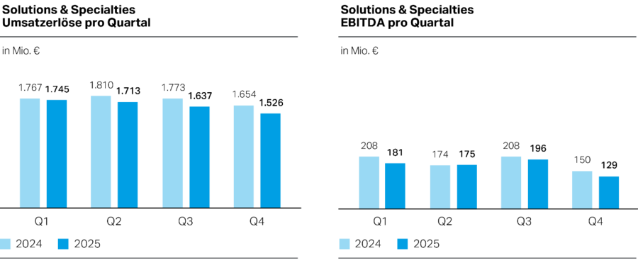 Das EBITDA von Solutions & Specialties sank im Geschäftsjahr 2025 um 8,0 % auf 681 Mio. € (Vorjahr: 740 Mio. €). Wesentlicher Treiber hierfür waren gesunkene Margen, da die niedrigeren Rohstoffpreise die gesunkenen Verkaufspreise nur teilweise kompensieren konnten. Daneben hatte eine negative Entwicklung der Wechselkurse einen ergebnismindernden Effekt. Demgegenüber wirkten sich gestiegene Absatzmengen, geringere Rückstellungen für die kurzfristige variable Vergütung sowie im Vorjahresvergleich niedrigere Aufwendungen in Höhe von 24 Mio. € im Zusammenhang mit dem Transformationsprogramm „STRONG“ positiv auf das Ergebnis aus. Zudem hatte eine ertragswirksame Buchung im Zusammenhang mit der Übernahme der Pontacol AG, Schmitten FR (Schweiz), einen positiven Effekt in Höhe von 12 Mio. € auf das Ergebnis.