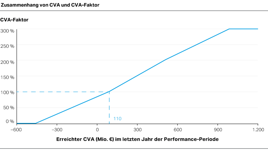 Für jede einzelne Kennzahl kann die Auszahlung zwischen 0 % (bei Nichterreichen der Mindestanforderungen) und 300 % liegen. Die Gesamtauszahlung aus der mittelfristigen Komponente wird als arithmetisches Mittel aus den einzelnen Auszahlungen aller vier Komponenten berechnet. Die Summe der Gesamtauszahlung ist jedoch auf 250 % des Zielwerts begrenzt. Sofern somit die Kapitalkosten in einem Geschäftsjahr nicht verdient werden (ROCE über WACC < 0), entfällt die Auszahlung aus der mittelfristigen Komponente vollständig, unabhängig von den Ergebnissen, die für die anderen Kennzahlen erzielt wurden.