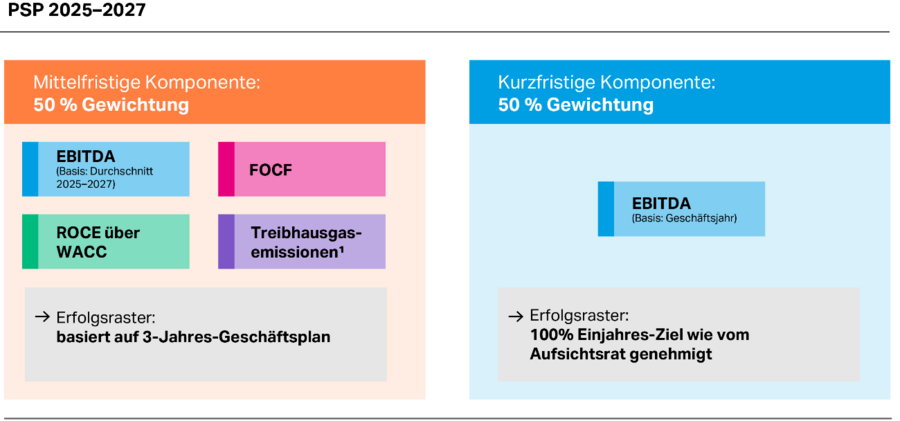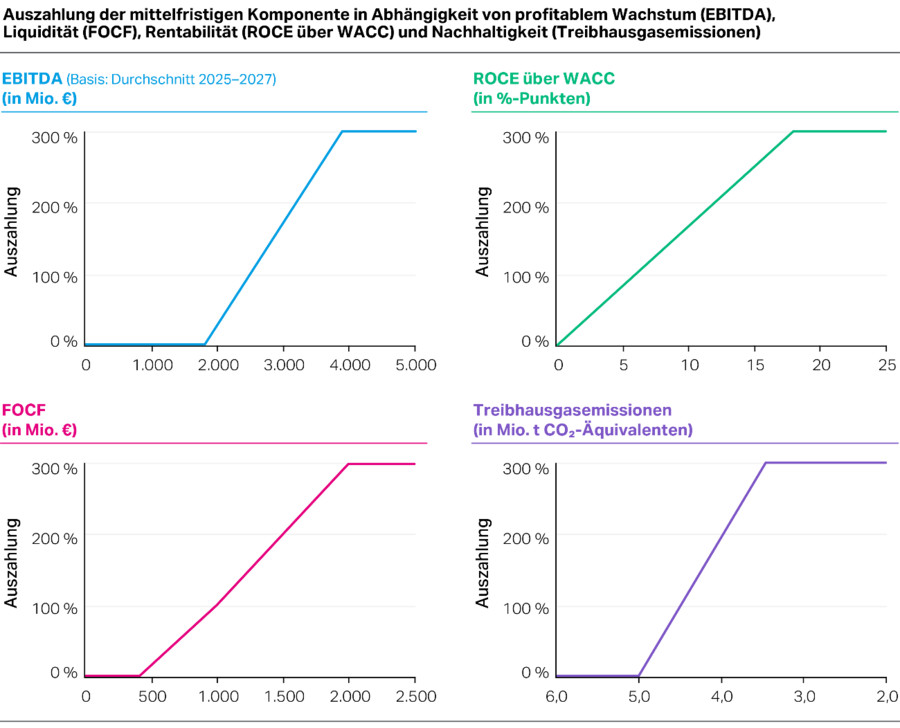 Für die mittelfristige Komponente werden die vier Komponenten gleichgewichtet einbezogen: profitables Wachstum, gemessen am EBITDA (Earnings before Interest, Taxes, Depreciation and Amortization), Liquidität, gemessen am Free Operating Cash Flow (FOCF), Rentabilität, gemessen am Return on Capital Employed (ROCE) über Weighted Average Cost of Capital (WACC), und Nachhaltigkeit, gemessen an ausgewählten Kriterien betreffend Umwelt, Soziales und Unternehmensführung (Environmental, Social and Governance, ESG). Seit dem Jahr 2025 sind für die Nachhaltigkeitskomponente die direkten und indirekten Treibhausgasemissionen (CO2-Äquivalente) der Emissionsstufen Scope 1 und 2 aller umweltrelevanten Standorte maßgeblich.