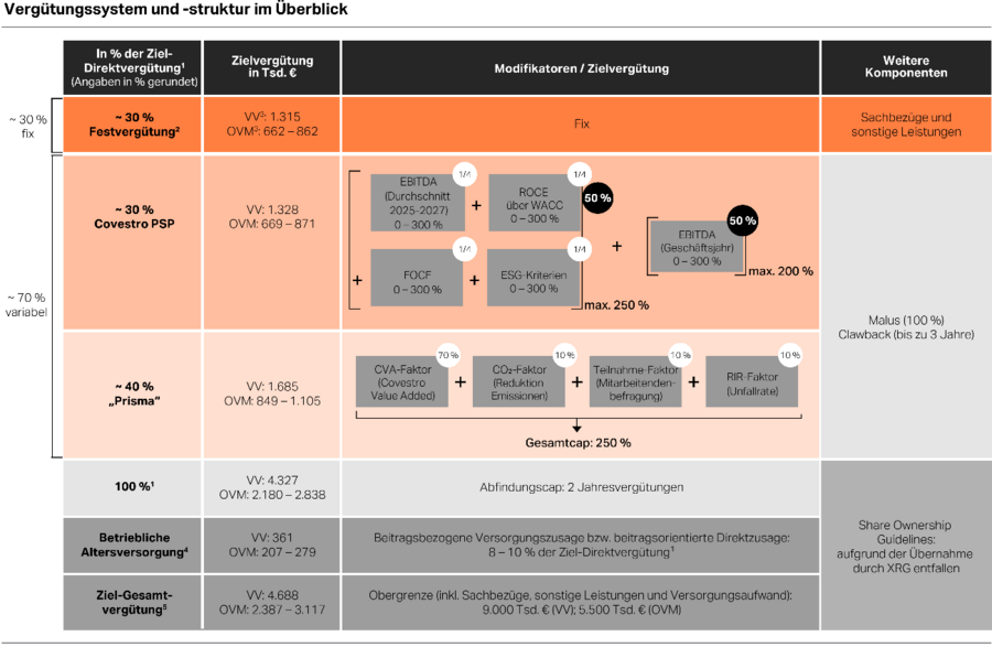 Nachfolgend wird über die Vergütung des Vorstands der Covestro AG für das Geschäftsjahr 2025 berichtet. Die Mitglieder des Vorstands der Covestro AG sind auch Mitglieder des Vorstands der Covestro Deutschland AG, die eine 100 %ige Tochtergesellschaft der Covestro AG ist. Eine Vergütung für die Tätigkeit als Vorstand der Covestro Deutschland AG wird nicht gewährt.