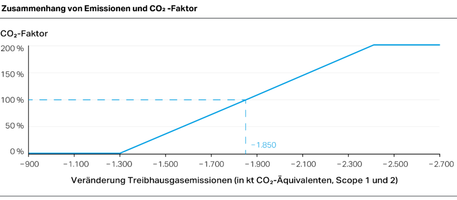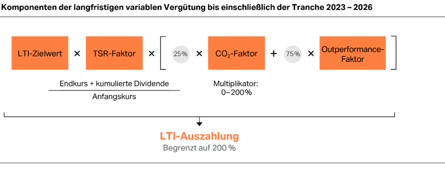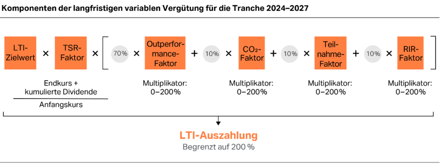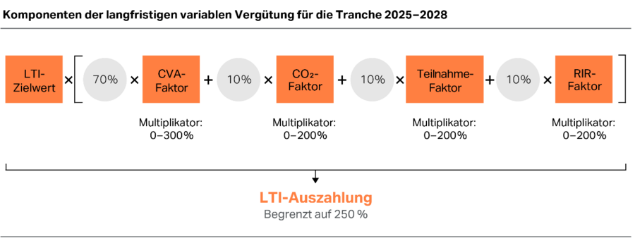 Zur Ermittlung der Auszahlung werden verschiedene Faktoren berechnet, deren Wert auf der Zielerreichung für die einzelnen Kennzahlen basiert: der TSR-Faktor und der Outperformance-Faktor (vor 2025), der CVA-Faktor (ab 2025) sowie als Bestandteile der Nachhaltigkeitskomponente der CO2-Faktor, der Teilnahme-Faktor und der RIR-Faktor, die im Nachfolgenden detailliert erläutert werden.