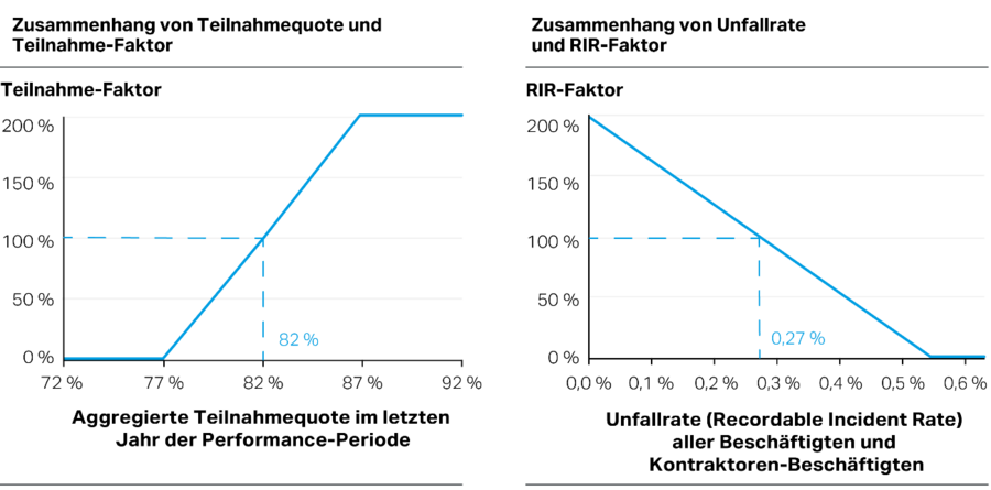 Die beiden Nachhaltigkeitskriterien aus dem Bereich „Soziales“, die Teilnahmequote an der regelmäßig stattfindenden Mitarbeitendenbefragung und die Unfallrate (Recordable Incident Rate, RIR), gehen erst mit den für die Jahre 2027 und 2028 zu ermittelnden Werten in die Auszahlung der „Prisma“-Tranchen 2024 – 2027 und 2025 – 2028 ein. Da sich aus dem aktuellen Stand für diese Kennzahlen keine Prognose für die Jahre 2027 oder 2028 ableiten lässt, werden beide Auszahlungsfaktoren für die Berechnung des beizulegenden Zeitwerts auf 100 % gesetzt.