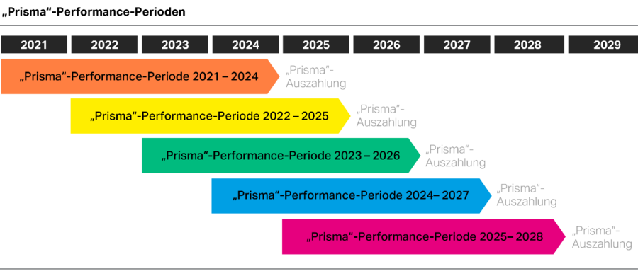 Für jedes Geschäftsjahr wird eine neue „Prisma“-Tranche mit einer vierjährigen Performance-Periode aufgelegt. Der Aufsichtsrat legt vor Beginn dieser Performance-Periode die Leistungskriterien für die finanziellen und die Nachhaltigkeitskennzahlen und die relative Gewichtung dieser Kriterien zueinander fest.