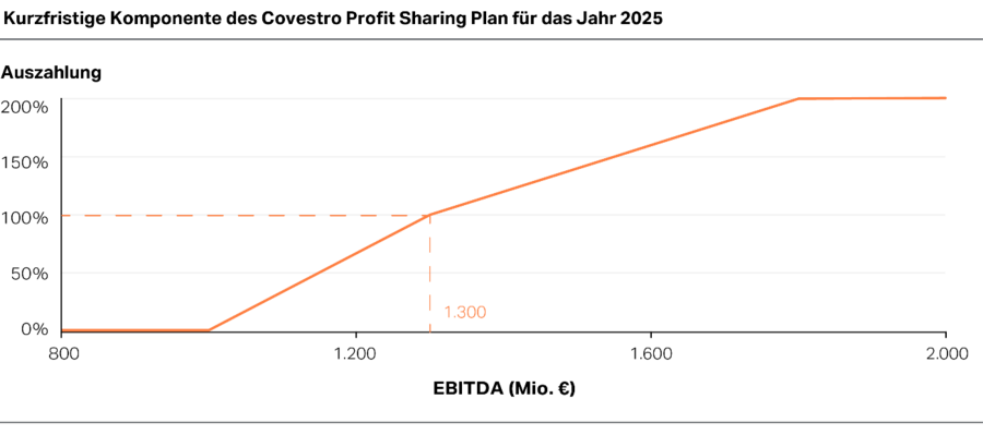 Mit Gültigkeit ab dem Geschäftsjahr 2025 wurde der „Covestro Profit Sharing Plan“ (Covestro PSP) erweitert. Zusätzlich zu den vier bereits verwendeten Leistungskennzahlen, für die sich die Zielsetzung aus der mittelfristigen Planung für die Jahre 2025 bis 2027 ableitet, wurde eine kurzfristige Komponente definiert. Diese basiert auf dem EBITDA-Ziel eines einzelnen Geschäftsjahres und wird im Rahmen der Planung für das jeweils folgende Jahr auf der Grundlage der Prognose im vierten Quartal vom Aufsichtsrat festgelegt. Die mittel- und kurzfristige Komponente werden zwecks Berechnung der Gesamtausschüttung jeweils zu 50 % gewichtet.