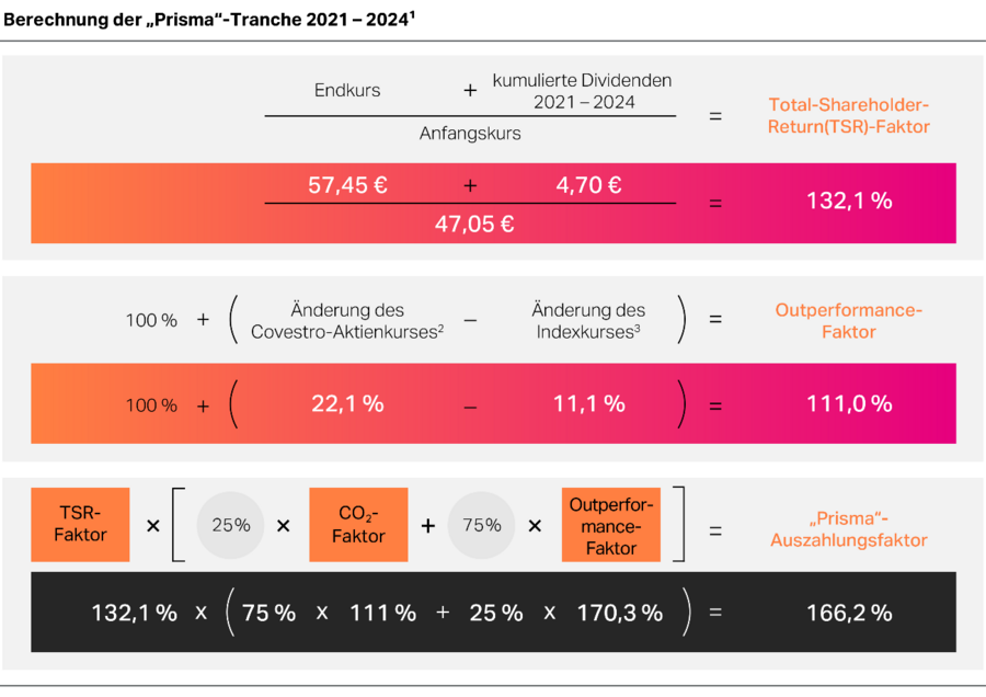 Der TSR-Faktor ergibt sich als Prozentsatz direkt aus der Aktienrendite (Summe des Endkurses der Covestro-Aktie und aller im Laufe der vierjährigen Performance-Periode pro Aktie ausgeschütteten Dividenden, dividiert durch den Anfangskurs).
